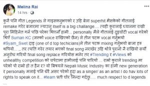 मेलिनाले स्टाटस लेखेर आपत्ती जनाइरहँदा यो गीत रिएरेन्ज गरेका राजन इशानले भने पुरानो गीतलाई रिएरेन्ज गरेर नयाँ बनाउँदा गाली आउनु स्वभाविक भएको बताएका छन् ।