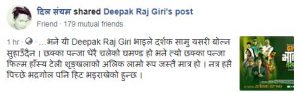 नायक दिपक राज गिरिको स्टाटसले सामाजिक संजालमा दर्शकको मन दुखेको प्रतिक्रिया छ भने कतिपयले घमण्डले बोलेको र दर्शकमा नराम्रो प्रतिक्रिया दिने गरि बोलेको जानकारी गरेका छन् ।