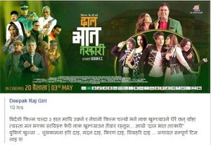 भात तरकारी भोलि वैशाख २० गते देखि हलमा प्रदर्शन हुँदै छ ।उक्त चलचित्रको पोस्ट गर्दै दिपकले नाक खुम्च्याउन तयार हुनुस समेत लेखेका छन् ।
