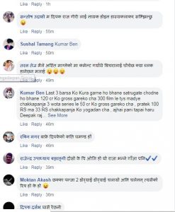 यो विषयमा दिपक राज गिरिले नेपालि चलचित्र हलमा लाग्दा नाक खुम्च्याउने र हिन्दि चलचित्र लाग्दा तिन हात माथि उफ्रने दर्शकहरु भनेर सामाजिक संजालमा स्टाटस लेखेका छन् ।