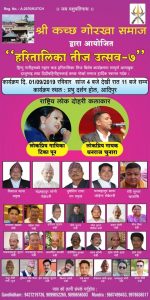 श्री कच्छ गोर्खा समाज ले आयोजना गरेको उक्त कार्यक्रममा कलाकारले झुम्काना , माईतिको देश , झम्के बुलाकी , नाच ,मैना , होनी तिम्रै कसम जस्ता दर्जनौ गीत प्रस्तुत गरेर महान पर्व हरितालिकालाई मनाउने छन् । भने साथमा अन्य कलाकार नायक नायिकाको पनि प्रस्तुत संगै जम्काभेट हुने छ।