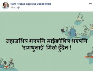 असोज ११ , काठमान्डौ – आज चितवनमा ज्ञानेद्र शाही कुटीएपछि नेकपाको भातृसंगठन रास्ट्रिय युवा संघ नेपालका संयोजक राम प्रसाद सापकोटा दीपशिखाले रामधुलाई मिठो हुँदैन भनेर आफ्नो सामाजिक संजालमा लेखेका छन्।