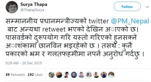थापाले भनेका छन् ‘प्रधानमन्त्रीको ट्वीटरको पासवर्ड दुरुपयोग भएको छ । उक्त विषयमा छानबिन भइरहेको छ ।’ प्रधानमन्त्री ओलीको ह्याण्डलबाट भएको रि–ट्वीट केही घण्टामै हटाइएको थियो ।