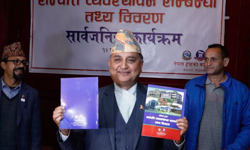 ट्रस्टको नाममा रहेको जग्गाको विषयमा अध्यन गर्न बनेको सम्पति व्य्वाव्स्थापन सम्बन्धि तथ्य विवरण नेपाल ट्रष्टले मंगलबार श्वेतपत्र सार्वनजिक गरेको छ ।