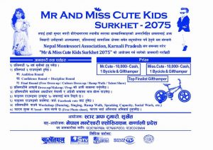 वैशाख २६, सुर्खेत – सुन्दरनगरी विरेन्द्रनगर सुर्खेतमा १० वर्ष मुनिका बालबालिकाको लागि भनेर मिस्टर यन्ड मिस क्युट किट २०७५ को आयोजना गरियको छ। ,