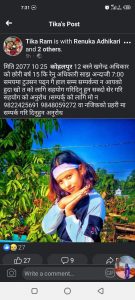 आमा झसङ्ग भैइन र रुन थालिन , म बिदेशमा छु छोरी घरमा भएको न भएको मलाई कसरी थाहा हुन्छ हजुरहरुलाई थाहा हुनुपर्ने हो भन्दै आत्तल्लिन र कल गरिन तर जति कल गर्दा पनि लागेन न त उन्को फेसबुकमानै कुरा भयो ।