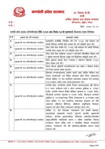 कर्णाली प्रदेश सरकार, मन्त्रिपरिषदले गत १७ गतेको बैठकबाट १२ वटा निर्णयसमेत गरेको छ । तेस्तै बैठकले प्रदेश विपद् व्यवस्थापन कोषमार्फत कोरोना संक्रमणबाट मृत्यु भएका परिवारलाई एक लाख रुपैयाँ दिने निर्णय गरेको हो।