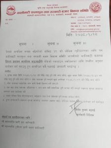 तेस्तै बजार परिसरभित्र मोटरसाइकल, साइकल तथा ठेलागाडा लैजान पाइने छैन भने ठूला कृषकले स्वास्थ्य सुरक्षा मापदण्ड अपनाएर अक्सन यार्ड वा होल्डिङ यार्डमा कारोबार गर्न सक्ने समितिले जनाएको छ।