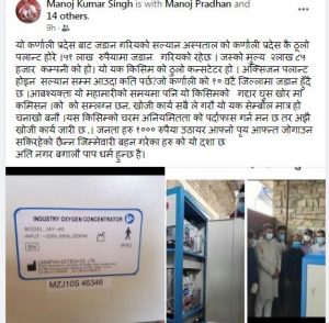 यो अक्सिजन प्लान्ट होइन यसको मूल्य ५१ लाखमा खरिद गरिएको भनिएको छ ,जिल्ला अस्पताल सल्यानको लागि स्वास्थ्य सेवा कार्यालयले ल्याएको खरिद गरेको उक्त सामाग्री ४ वटा कन्सिन्ट्रटर बराबर अर्थात प्रती मिनेट ४० लिटर अक्सिजन सप्लाइ गर्ने मेसिन हो ।