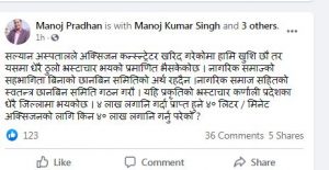 कोभिड -१९ को महामारीमा जनताको स्वास्थ्यमा खेलबाड गर्ने र यति ठुलो भ्रस्टाचार गर्ने जो कोहीलाई नछोडिने मनोज प्रधानले बताए । नागरिक समाज सहितको स्वतन्त्र छानबिन समिति गठन गर्नुपर्ने उनको माग छ । ४ लाख लगानि गर्दा प्राप्त हुने ४० लिटर / मिनेट अक्सिजनको लागि किन ४० लाख लगानि गर्नु परेको किन भन्दै उनले प्रश्न गरे।
