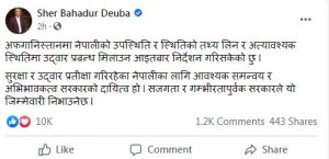 सोमबार बिहान ट्विट गर्दै प्रधानमन्त्री देउवाले अफगानिस्तानमा नेपालीको उपस्थिति र स्थितिको तथ्य लिन आइतबार नै निर्देशन दिएको बताए ।
