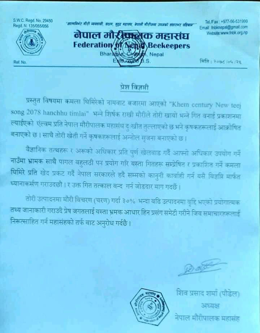 मौरीपालक महासंघले गीत सम्प्रेषित र प्रकाशित गर्नेप्रति खेद प्रकट गर्दै कानुनी कारवाही गर्न आग्रह गरेको छ । साथै, यो गीतको प्रशारण बन्द गर्न पनि महासंघले माग गरेको छ ।