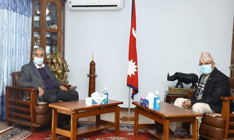 काठमाडौं- प्रधानमन्त्री शेरबहादुर देउवा र एमाले अध्यक्ष केपी शर्मा ओलीको ओली निवास बालकोटमा अभेत वार्ता भएको छ। देउवा आज ओलीलाई भेट्न बालकोट पुगेका थिए।