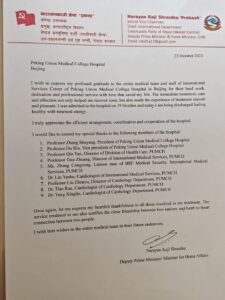 लगत्तै उनलाई बेइजिङस्थित पेकिङ युनियन मेडिकल कलेजमा अस्पतालमा भर्ना गरिएको थियो । एन्जियोग्राम गरेर हेर्दा मुटुको एकातर्फको भल्भमा रक्तसञ्चारमा अवरोध देखिएपछि त्यसलाई स्टेन्ट राखेर खुलाइएको थियो ।