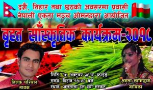 जसमा गायक तिलक परियार पनि ओमनमा सहभागी हुने जानकारी छ । १९ अक्टुबर सुक्रबारको दिन बिहान ११ बजे ओमनको अलमासा हल रुवी मस्कटमा कार्यक्रम हुने छ । सामाजिक सञ्जाल फेसबुकबाटै अमृताले सबैलाई कार्यक्रममा सहभागी हुन आउन पनि आग्रह गरेकी छिन  ।ओमन बाट फर्के लगतै नेपालको विभिन्न स्थान सुर्खेत , दाङ् लगायतमा उनको प्रस्तुति रहने छ ।